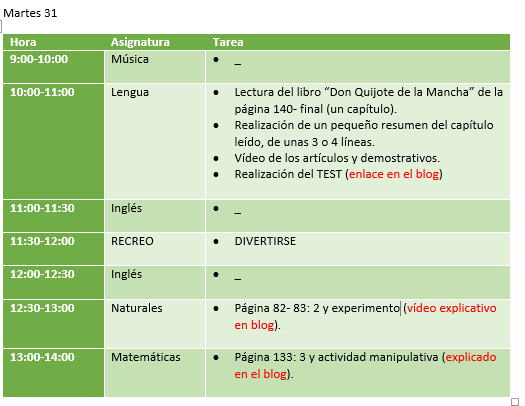 Tareas del 31 (martes) de marzo.